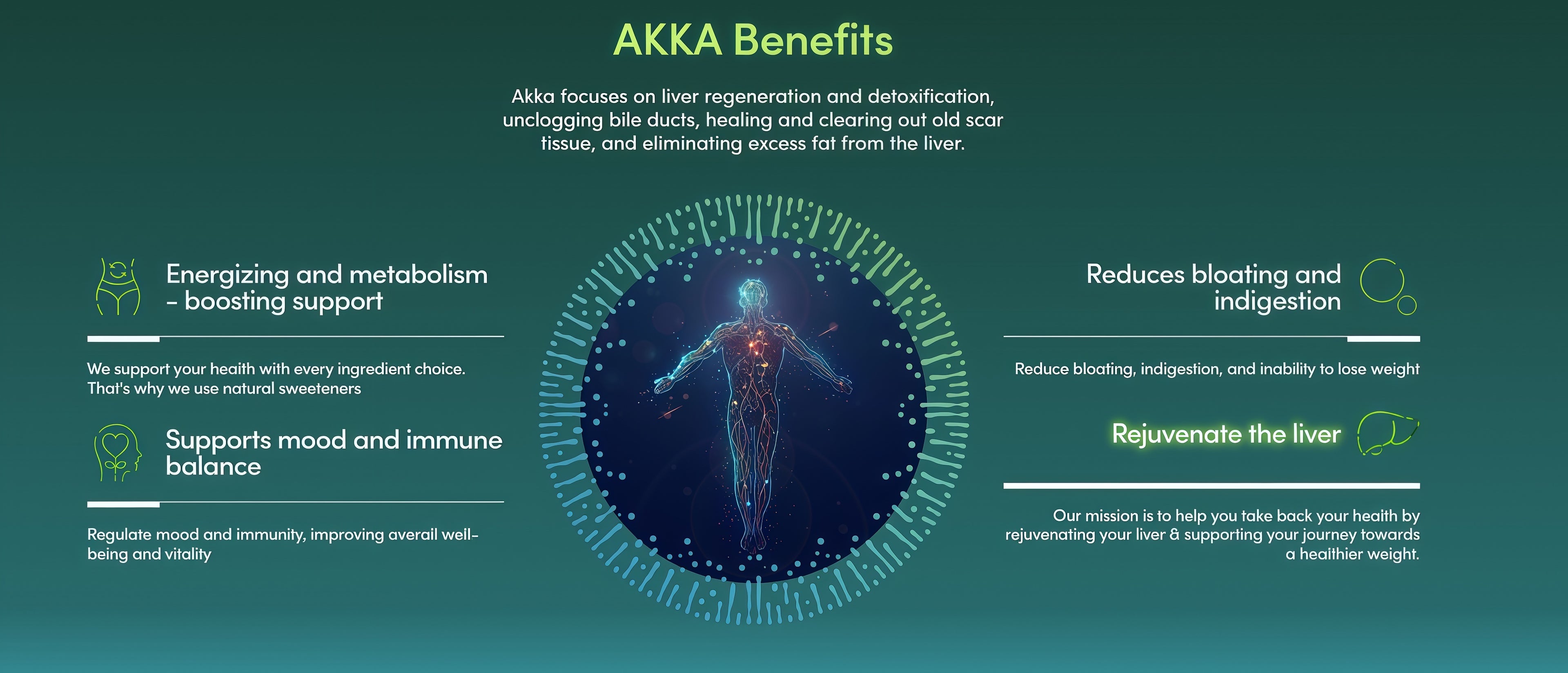 Akka focuses on liver regeneration and detoxification, unclogging bileducts, healing and clearing out old scar tissue, and eliminating excessfat from the liver.